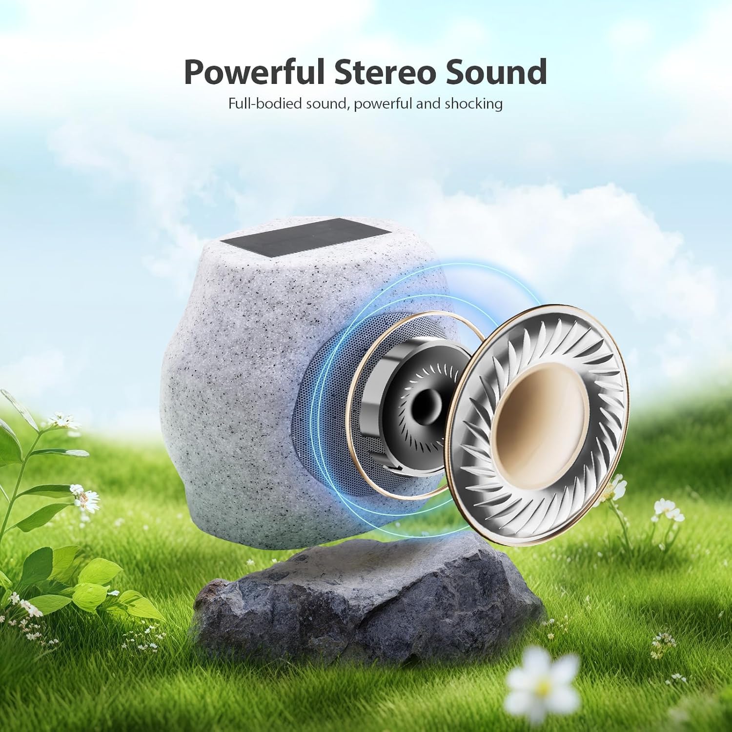 - 【Superior Sound Quality】The sound quality has been modulated by professional mixers to experience powerful deep bass and rich audio, and the product supports Wireless Stereo Pairing function, allowing you to experience 360° high-definition stereo sound. Their rock-like design blends seamlessly into gardens and patios, making these speakers perfect for lively patios and gardens. Solar-powered outdoor Bluetooth speakers brighten up any outdoor gathering and are perfect for gardens, patios, decks and pool parties. TIP: Our rock speakers only support up to two speaker devices, but do not support to connect three or more devices.